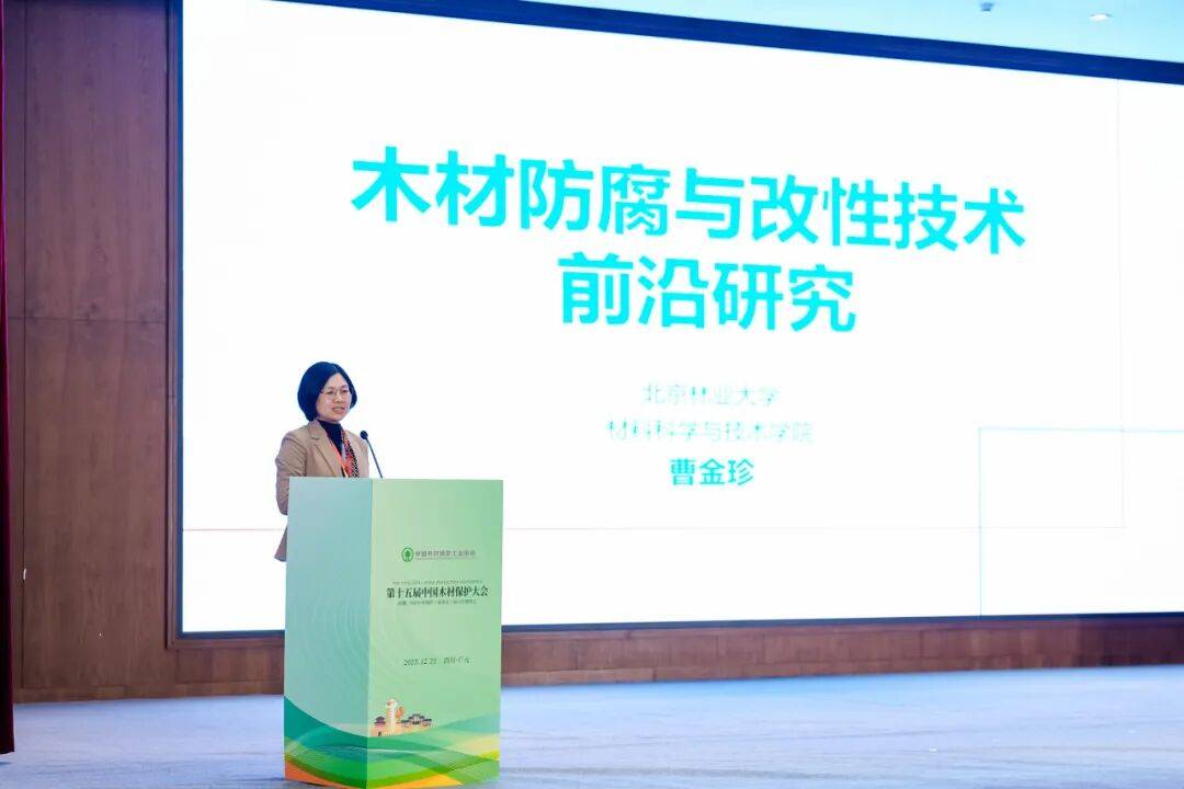 北京林业大学材料科学与技术学院教授、博士生导师曹金珍分享了《木材防腐与改性技术前沿研究》。她回顾了传统木材防腐与改性的区别,并重点介绍了当前研究热点,如木材矿化改性等。曹教授指出,这些前沿技术不仅致力于延长木材使用寿命、扩大其在地板、户外景观等苛刻环境下的应用范围,更是提升木材这一可再生资源综合价值的关键路径。